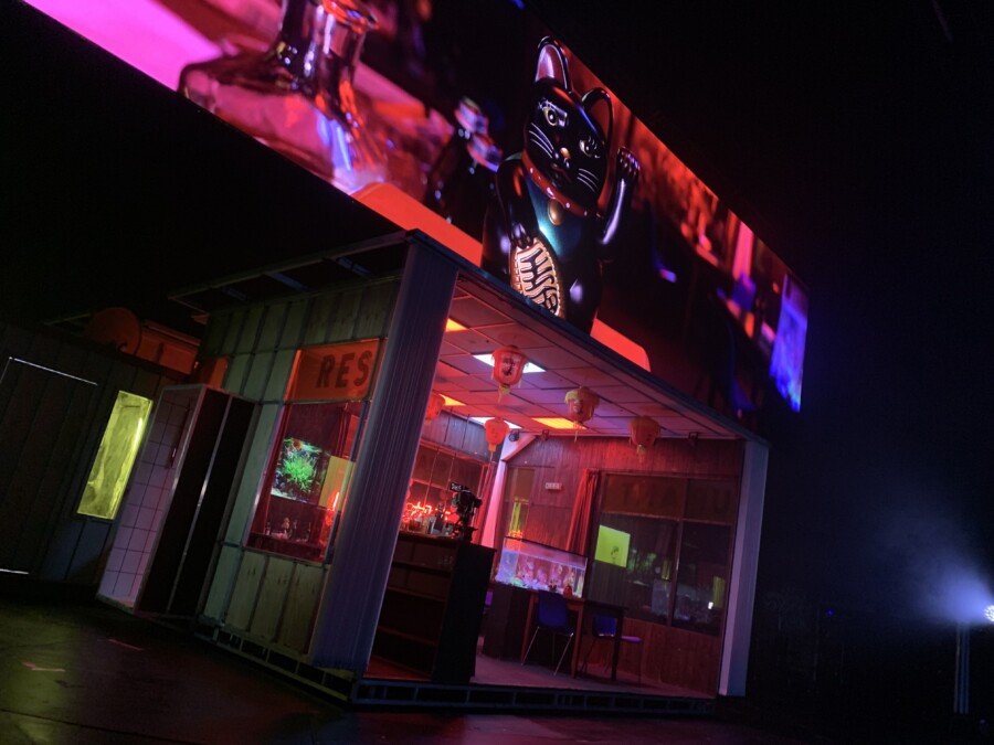 本物/偽物の二項対立はこうして生身/映像、リアルタイム/録画、俳優/役、現在/過去(しかし舞台上の過去とは何か?)など様々に変奏され、混線していく。圧巻だったのは、舞台美術のダイナミックな動きとそれを映した映像の組み合わせによって観客の「現実」を揺るがすその視覚的スペクタクルだ。たとえば、舞台美術を内包したコンテナはしばしば俳優やスタッフによって大胆に移動され、向きや位置関係を変えていく。一方、舞台装置とともに移動し続けるカメラが捉える等身大の映像は微動だにせず、同じ画角を映し続ける。「現実」とそれを映した映像という、本来は同一であるはずの二対はそうして引き裂かれていく。その瞬間、私は時空間が歪んだかのような目眩を覚えたのだった。それはむしろ現実の方が私から遠のいていくような感覚でさえあった。