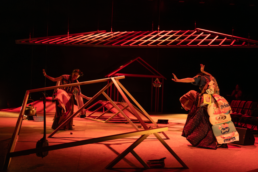 国際芸術祭「あいち2025」のパフォーミングアーツ部門プログラム作品の一つとして、AKNプロジェクトによる喜劇『人類館』(作:知念正真、演出:知念あかね、新垣七奈)が愛知県芸術劇場小ホールにて上演された[1]。1976年に演劇集団「創造」によって初演された『人類館』は、1903年に大阪で起きた「人類館事件[2]」に題を取りつつも、「ごっこ遊び」と「ドンデン返し」を複雑に組み合わせ、近現代沖縄において反復されてきた差別や抑圧の歴史を描きだした、戦後演劇史における特異点的な作品だ[3]。本作の登場人物は3名のみで、それぞれに具体的な名前は与えられず、「調教師ふうな男(以下、調教師)」(神田青)、「陳列された男(以下、男)」(仲嶺雄作)、「陳列された女(以下、女)」(井上あすか)とあるだけだ。物語は、「人類館」で展示された男と女のところへやってきた調教師による「みなさん今晩は。今日は我が「人類館」へようこそおいでくださいました」という口上から始まる。そこからさまざまな枠物語を横断しつつ、方言札や「イモ・はだし論」など沖縄と不可分な文言やエピソードを散りばめながら、人類館事件はもちろん、皇民化教育や沖縄戦、米軍支配からベトナム戦争、本土復帰に至るまでの沖縄近現代史を辿っていく。
